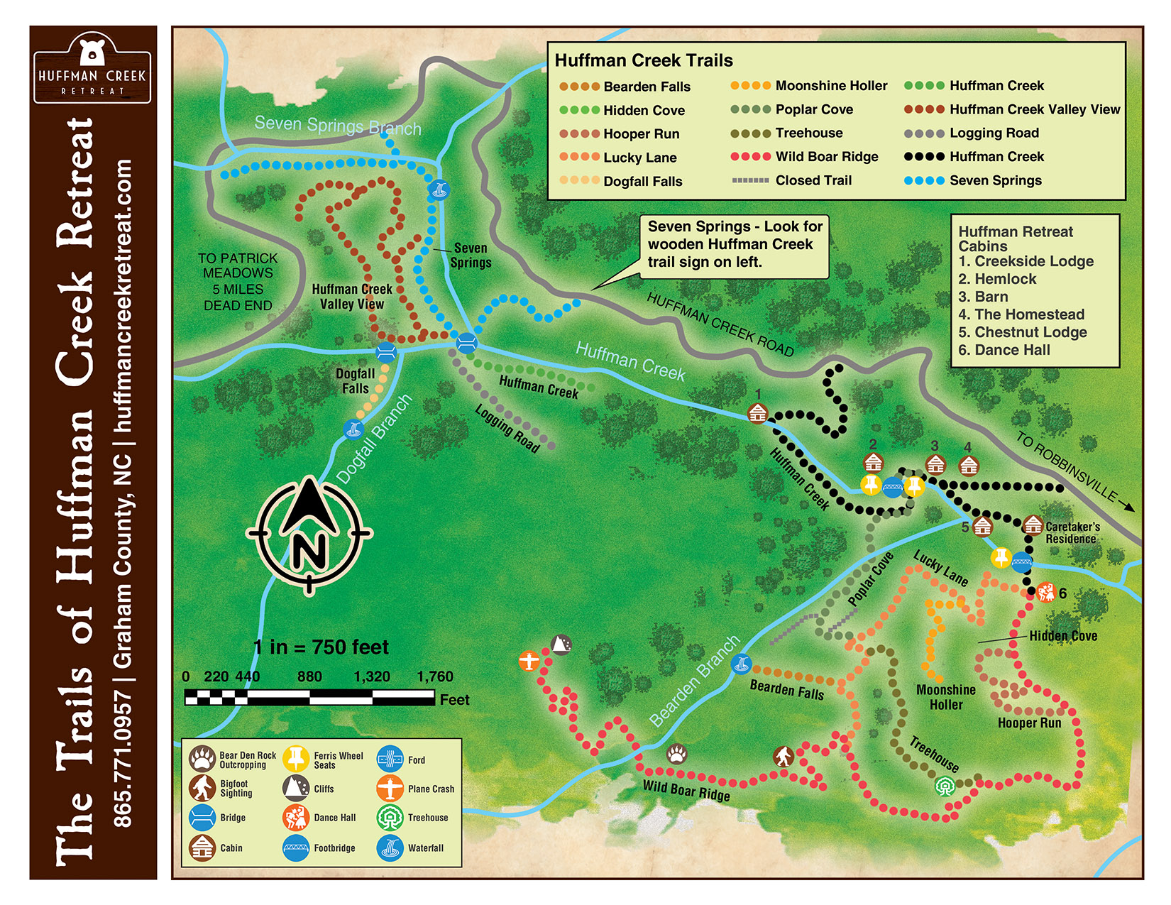 With over 500 acres to explore, Huffman Creek Retreat is a great place to begin your vacation adventure. While hiking onsite you will find waterfalls, creeks, treehouses, plane crash sites and more! Click below for the Huffman Creek Hiking Map!